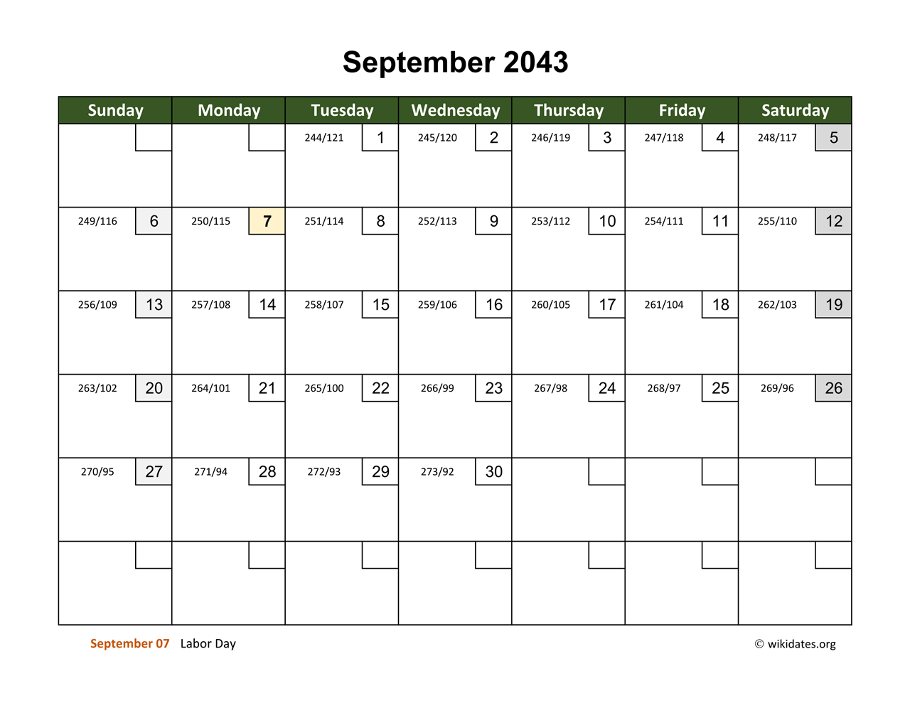 September 2043 calendar with day numbers, including US federal holidays, available in PDF file format, landscape/horizontal orientation, free for print or download.