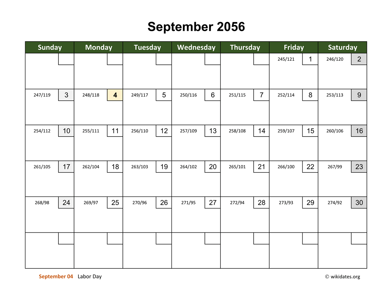September 2056 Calendar with Day Numbers