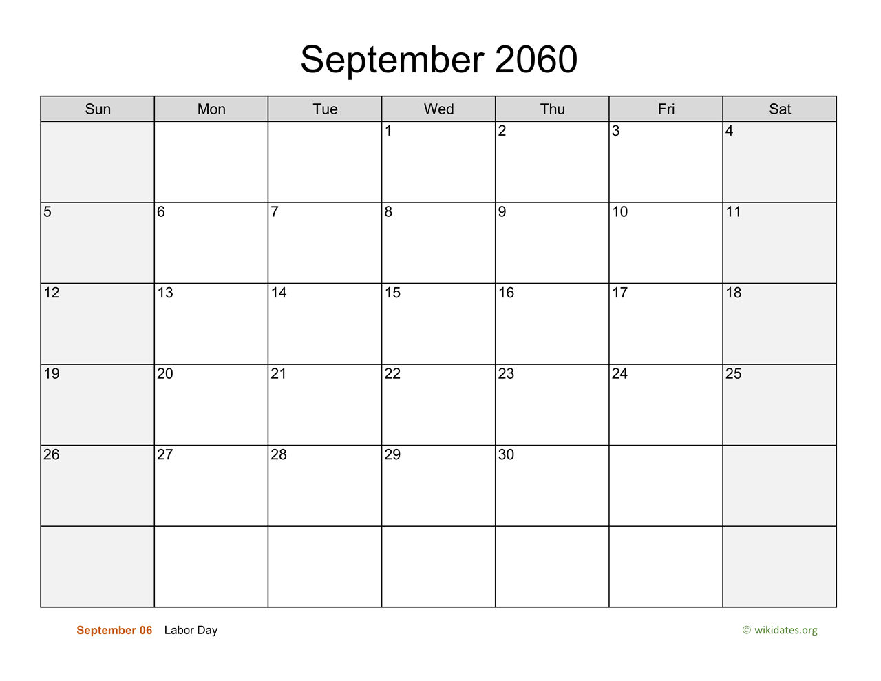 September 2060 Calendar with Saturday and Sunday are shaded in light gray, this template lets you include your schedule, events, notes, to-do list and holidays.