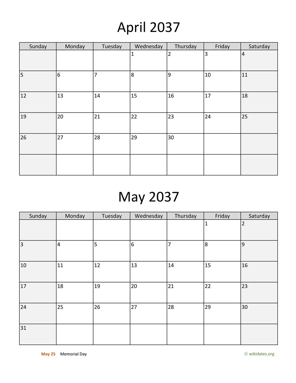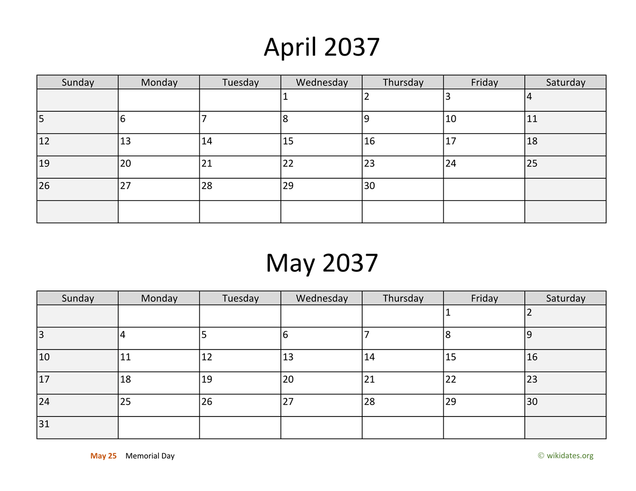 • April and May 2037 Calendar with US federal holidays as PDF (Adobe Reader PDF) in US letter paper format, free for download and print.