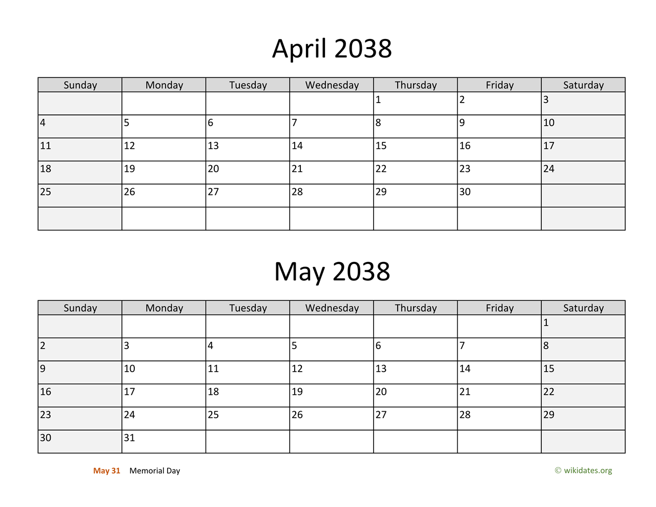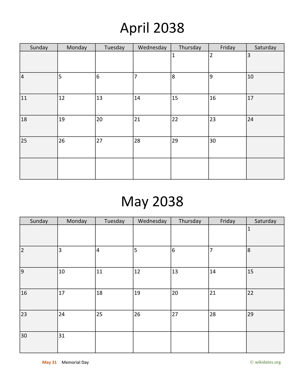 • April and May 2038 Calendar with US federal holidays as PDF (Adobe Reader PDF) in US letter paper format, free for download and print.