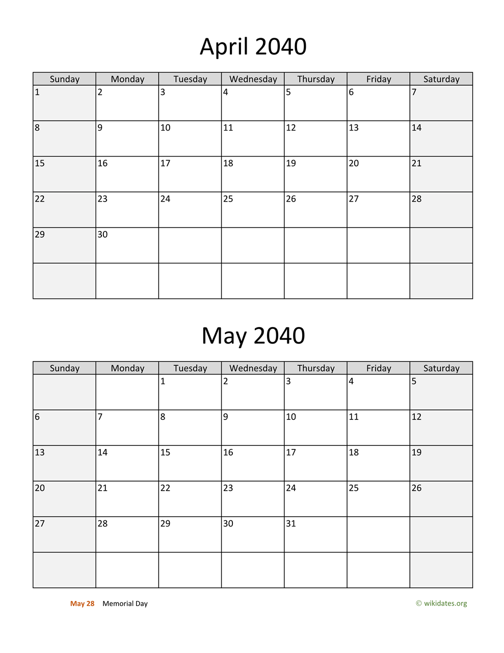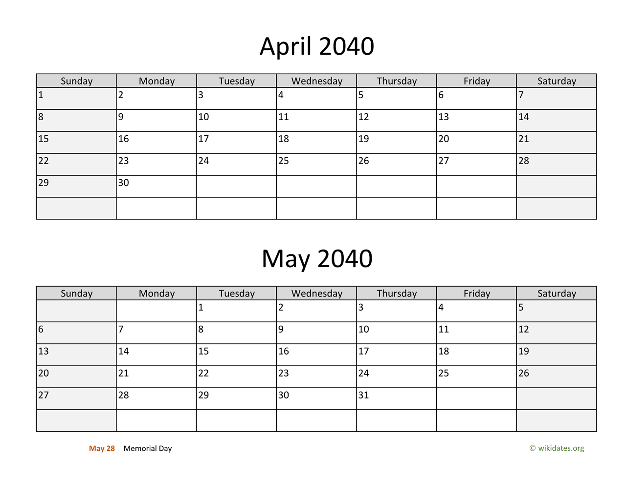 • April and May 2040 Calendar with US federal holidays as PDF (Adobe Reader PDF) in US letter paper format, free for download and print.
