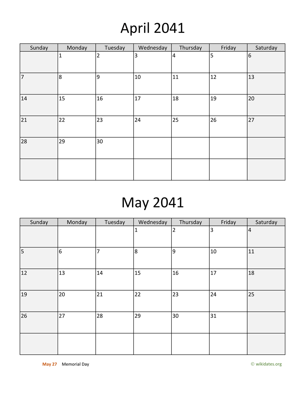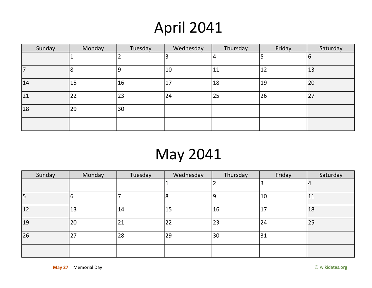 • April and May 2041 Calendar with US federal holidays as PDF (Adobe Reader PDF) in US letter paper format, free for download and print.