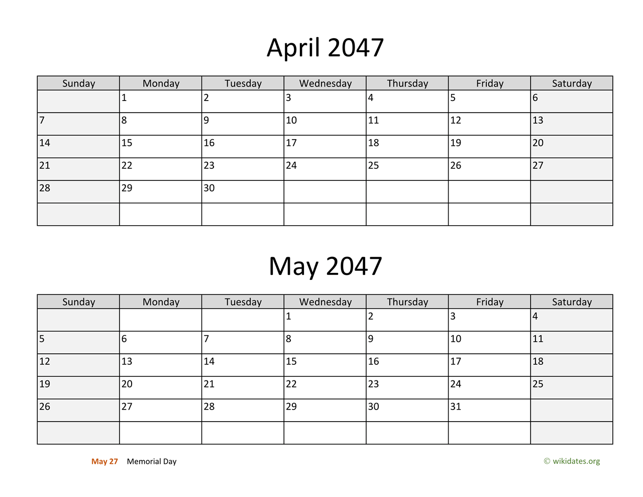 • April and May 2047 Calendar with US federal holidays as PDF (Adobe Reader PDF) in US letter paper format, free for download and print.