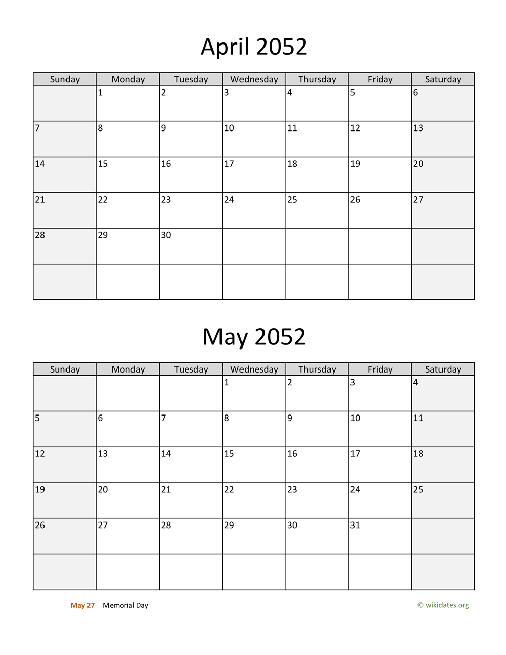 • April and May 2052 Calendar with US federal holidays as PDF (Adobe Reader PDF) in US letter paper format, free for download and print.