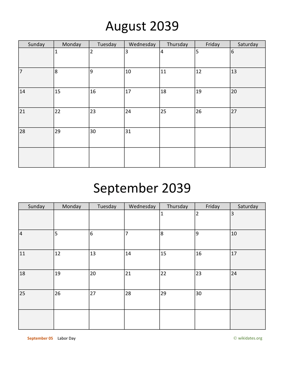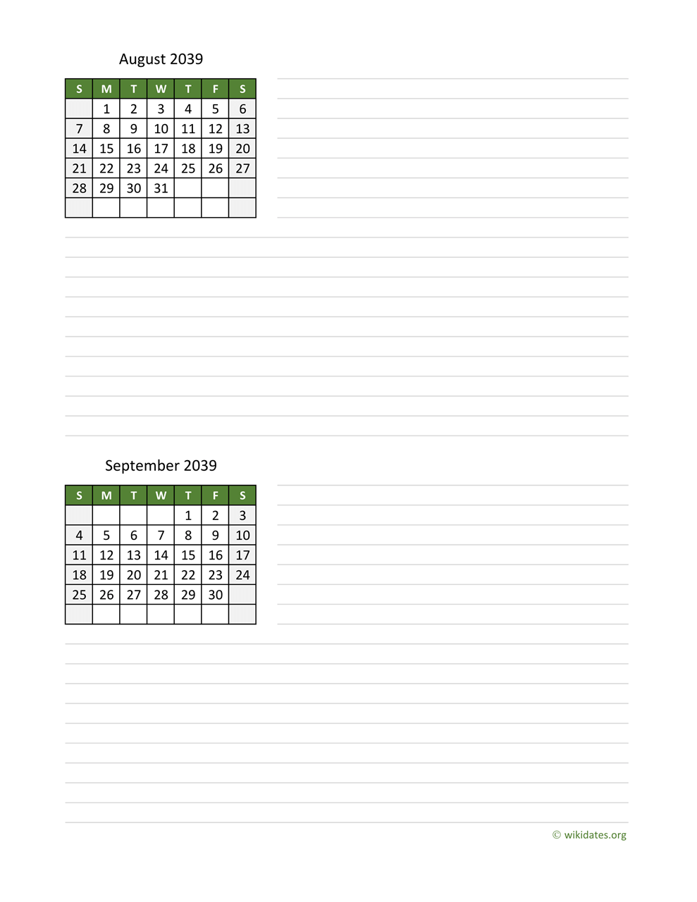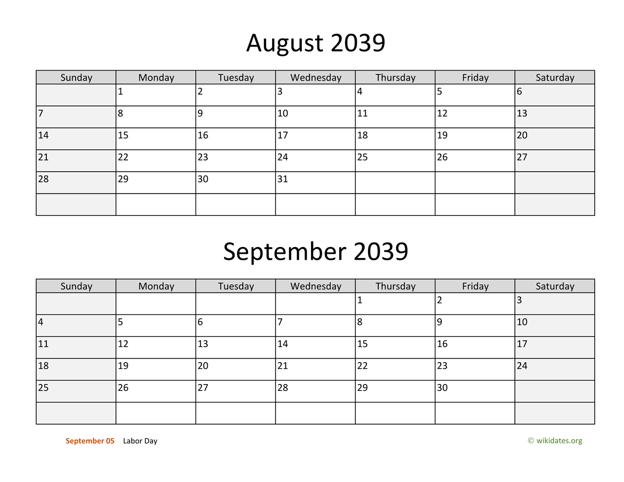 • August and September 2039 Calendar with US federal holidays as PDF (Adobe Reader PDF) in US letter paper format, free for download and print.