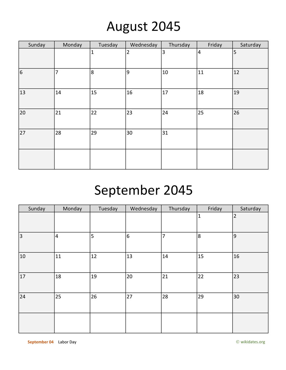 • August and September 2045 Calendar with US federal holidays as PDF (Adobe Reader PDF) in US letter paper format, free for download and print.