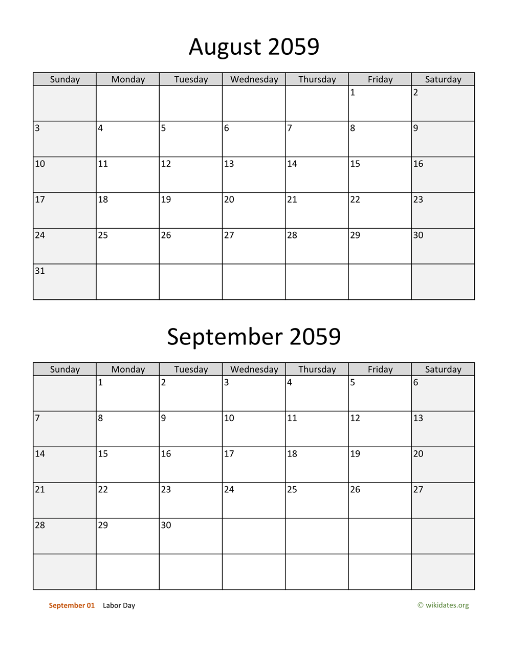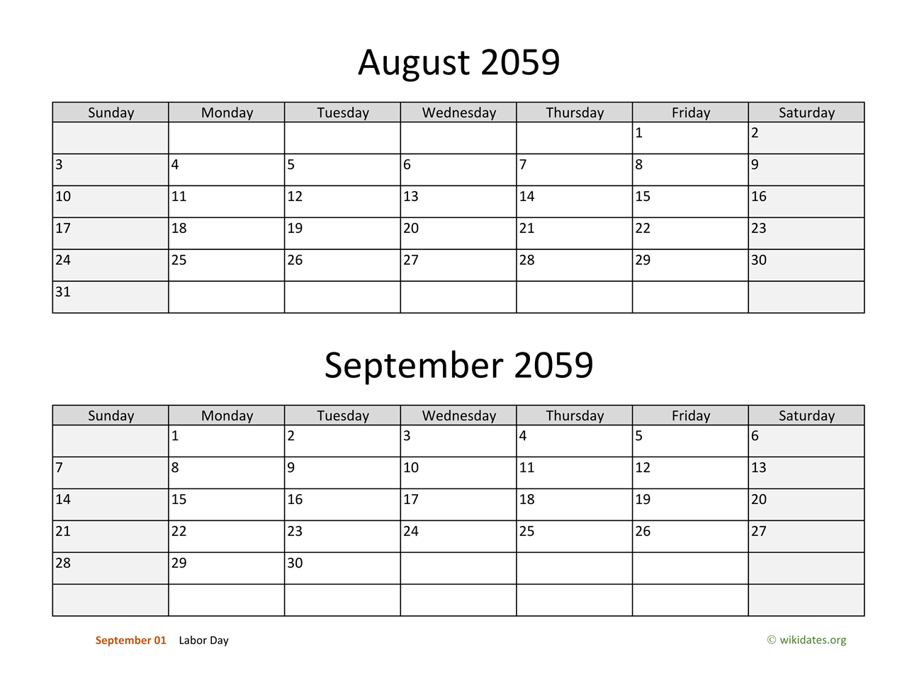 • August and September 2059 Calendar with US federal holidays as PDF (Adobe Reader PDF) in US letter paper format, free for download and print.