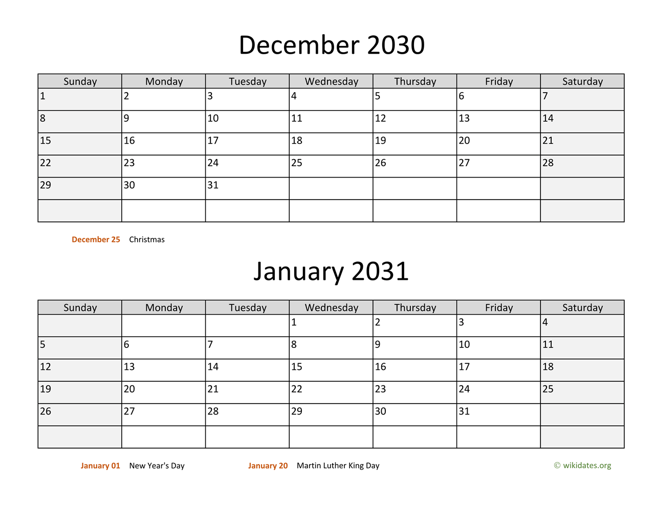 • December 2030 and January 2031 Calendar with US federal holidays as PDF (Adobe Reader PDF) in US letter paper format, free for download and print.