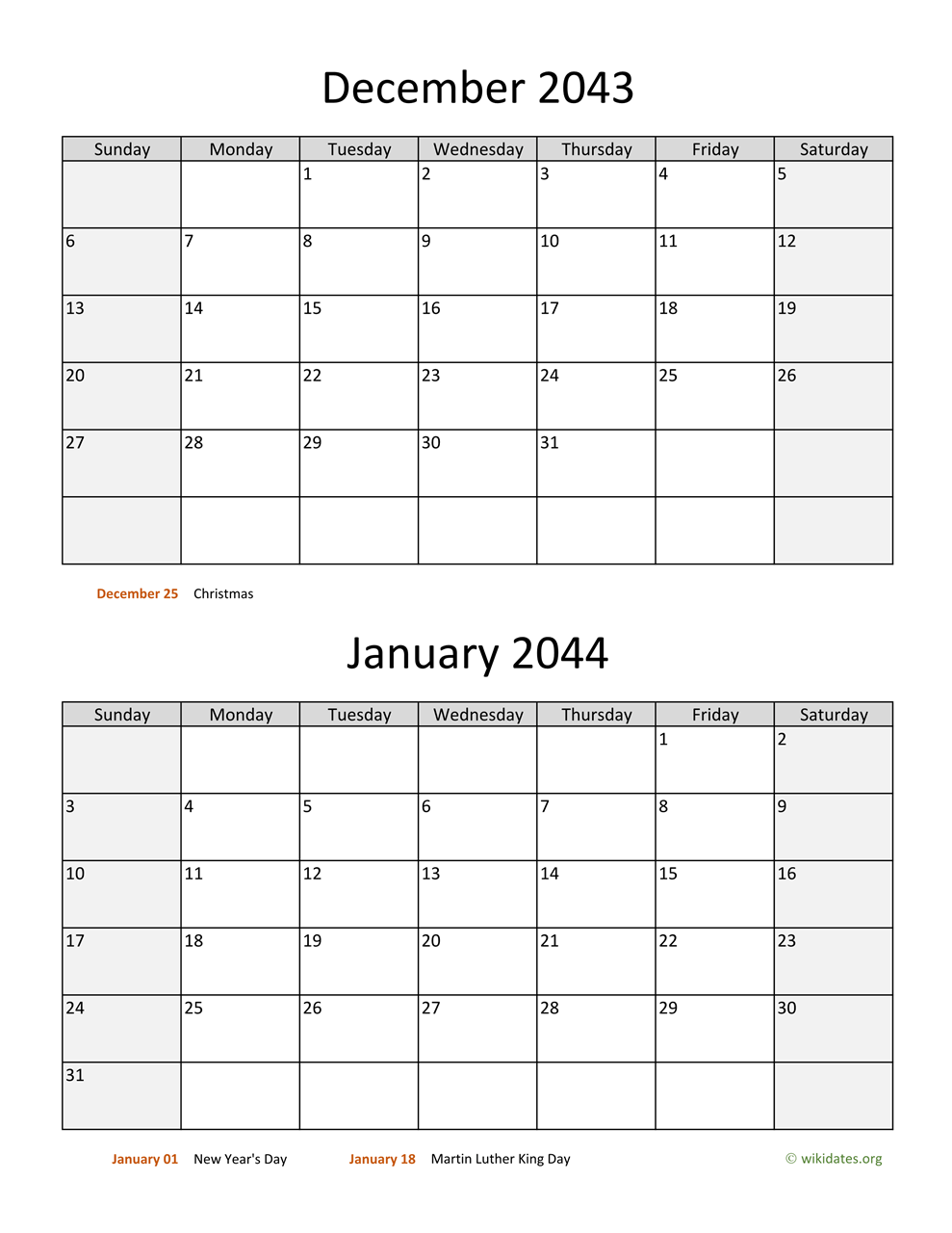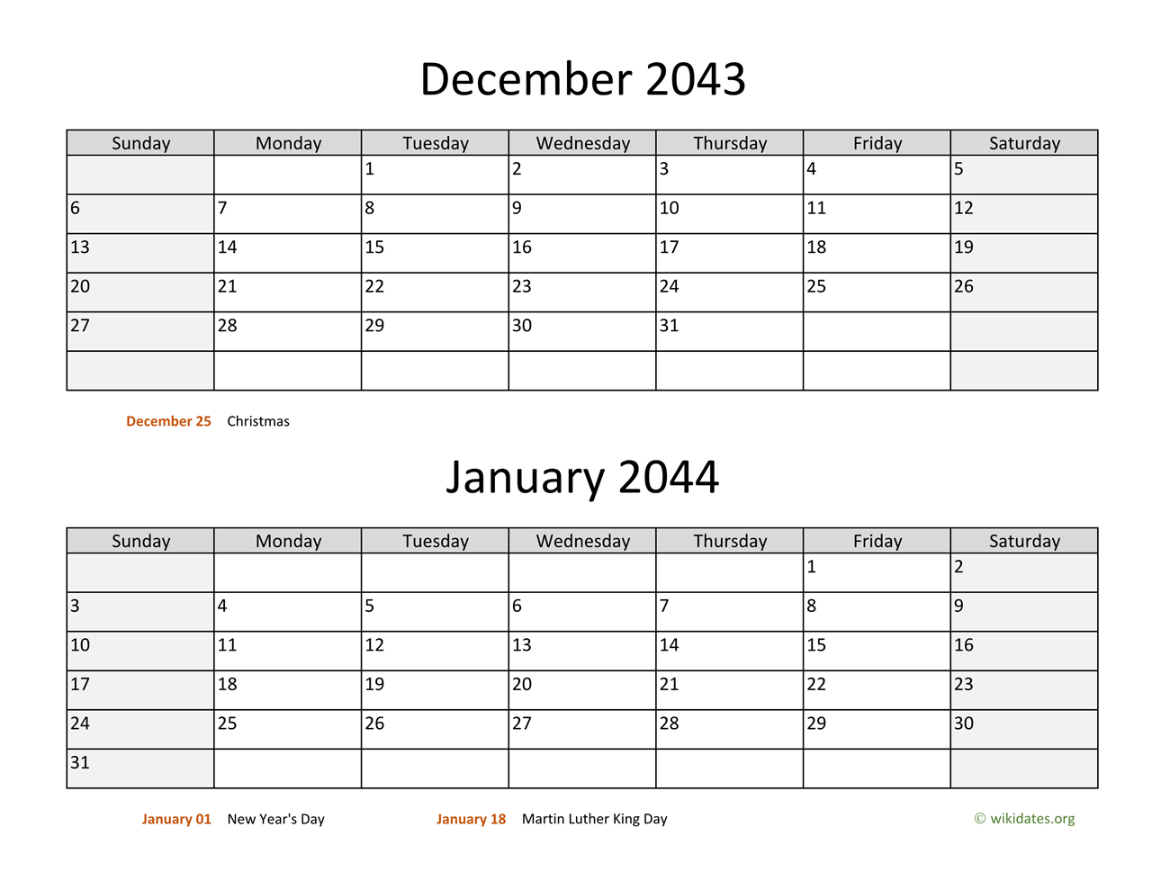 • December 2043 and January 2044 Calendar with US federal holidays as PDF (Adobe Reader PDF) in US letter paper format, free for download and print.