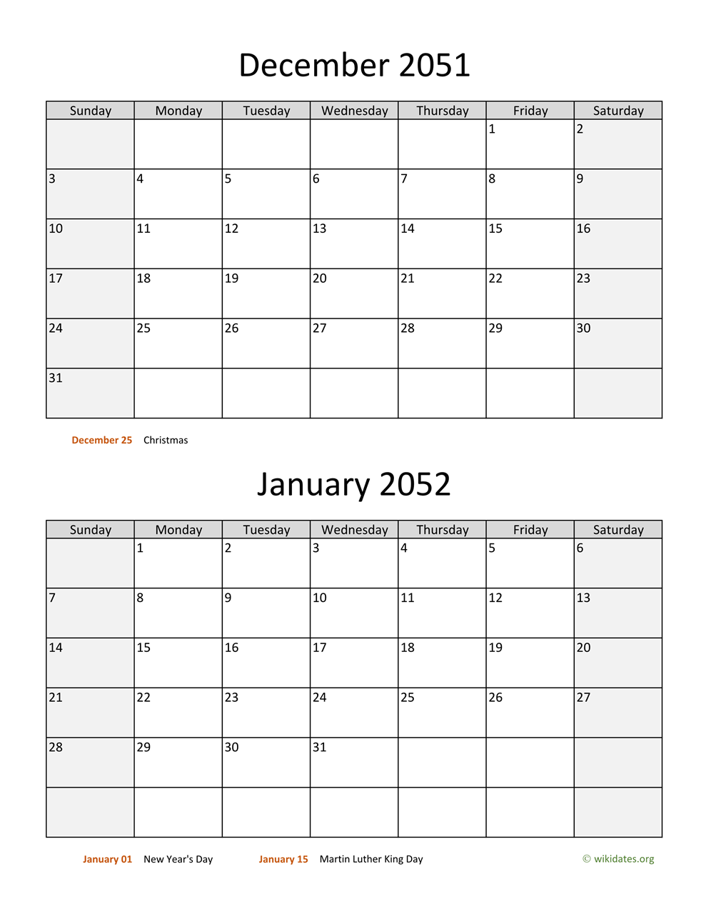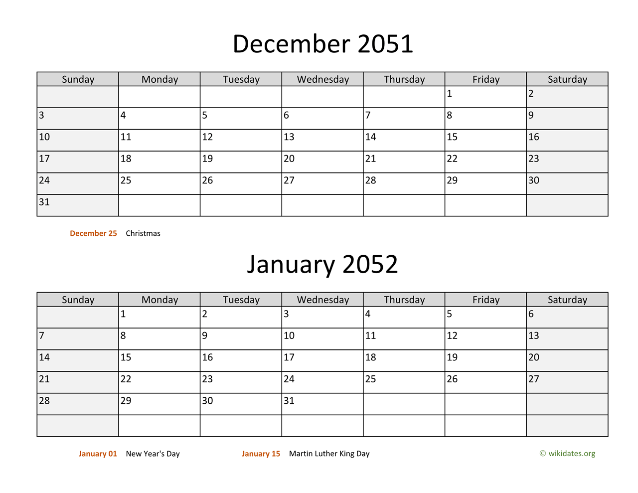 • December 2051 and January 2052 Calendar with US federal holidays as PDF (Adobe Reader PDF) in US letter paper format, free for download and print.