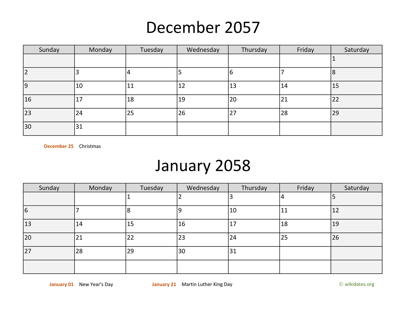 • December 2057 and January 2058 Calendar with US federal holidays as PDF (Adobe Reader PDF) in US letter paper format, free for download and print.