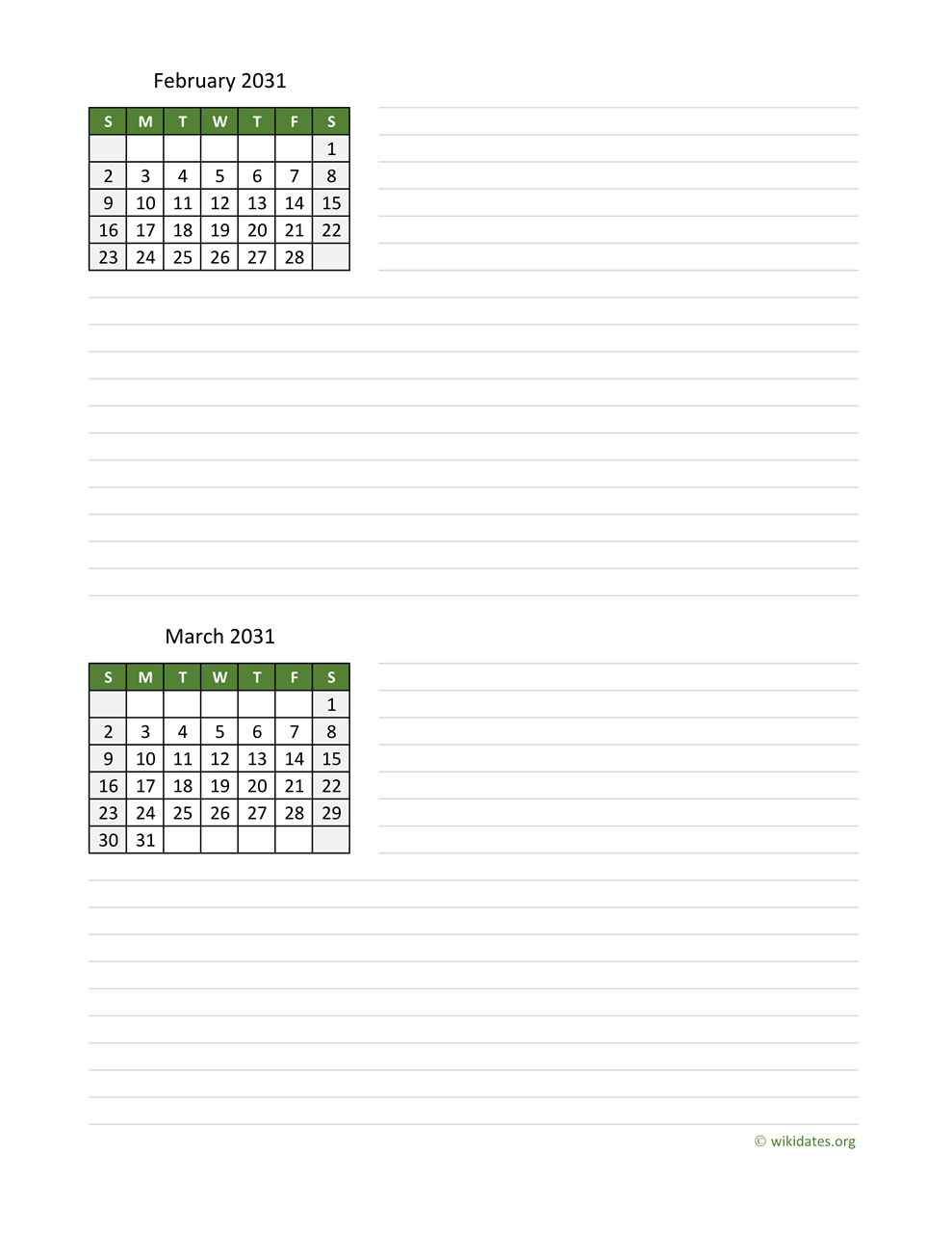 February and March 2031 Calendar