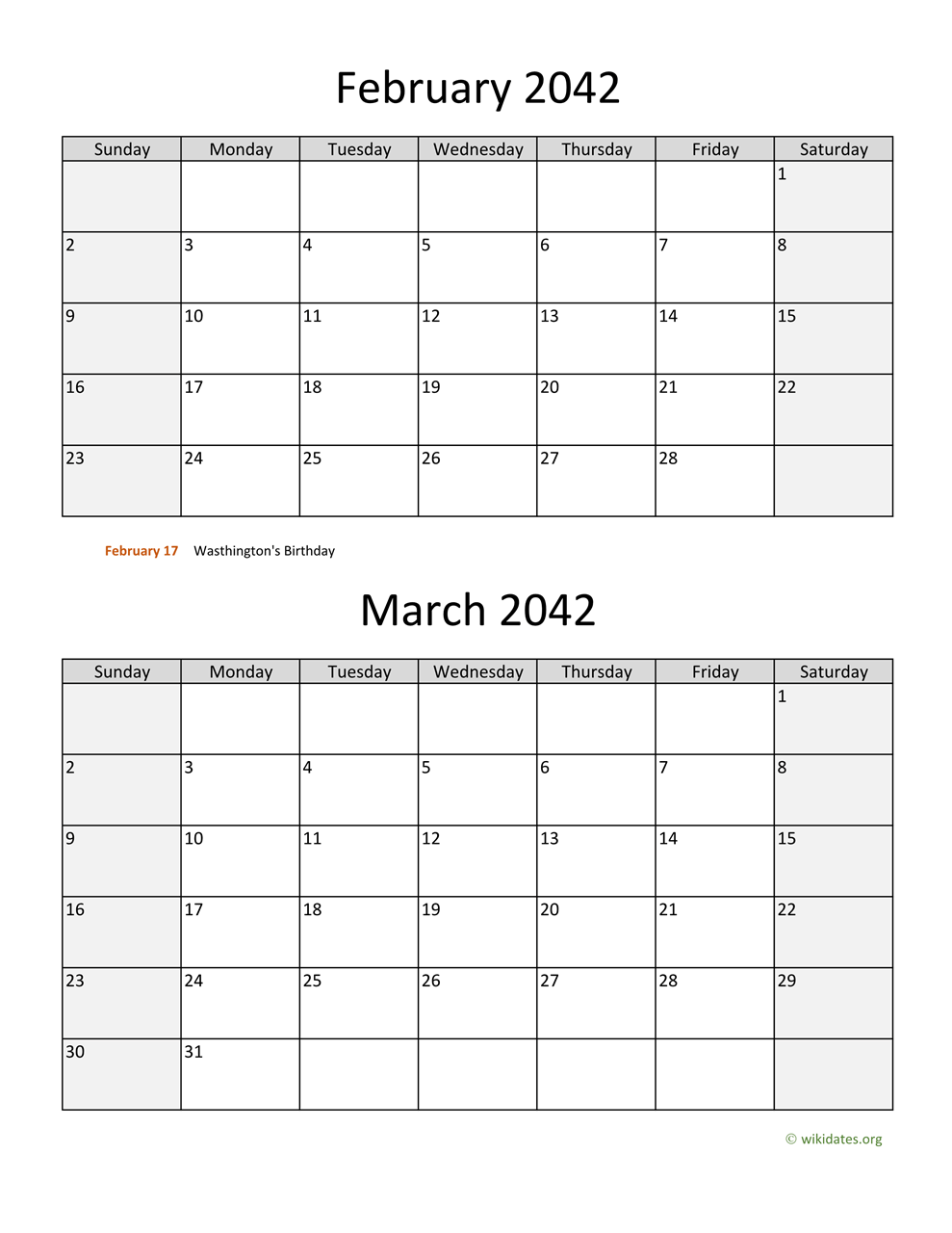 • February and March 2042 Calendar with US federal holidays as PDF (Adobe Reader PDF) in US letter paper format, free for download and print.