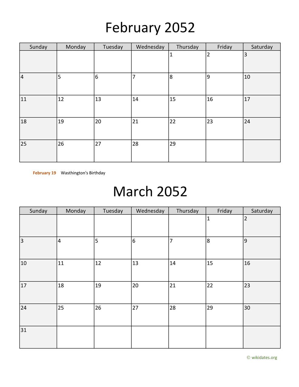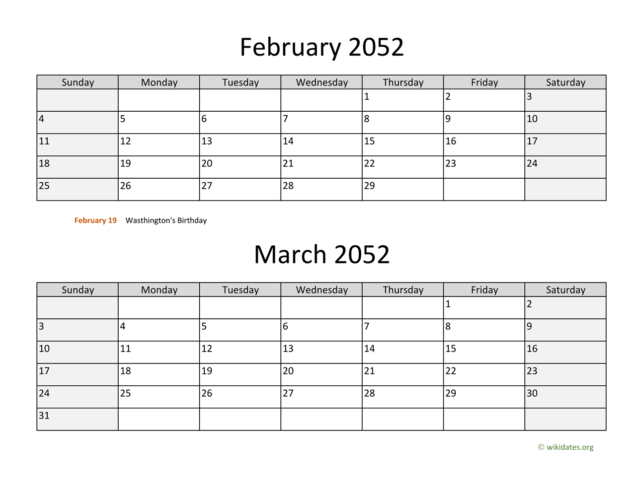• February and March 2052 Calendar with US federal holidays as PDF (Adobe Reader PDF) in US letter paper format, free for download and print.