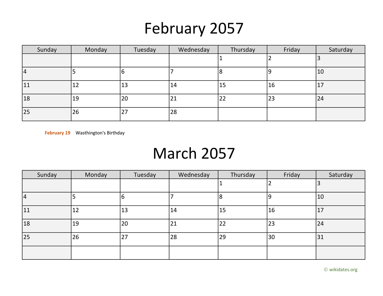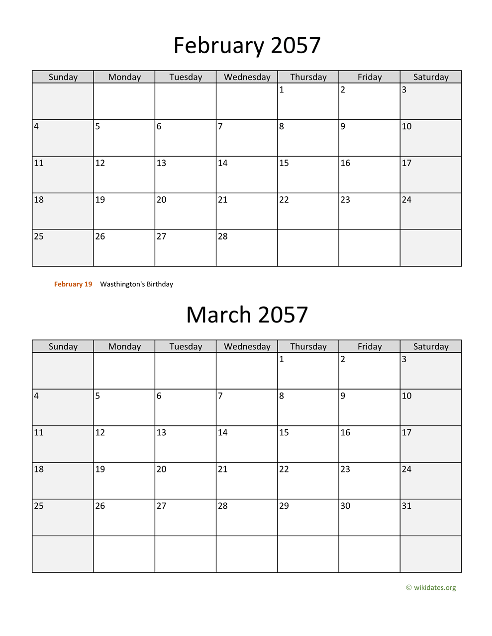 • February and March 2057 Calendar with US federal holidays as PDF (Adobe Reader PDF) in US letter paper format, free for download and print.