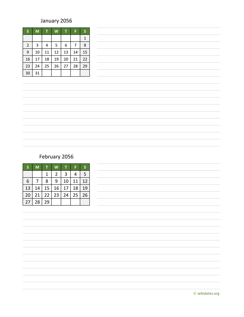 January and February 2056 Calendar
