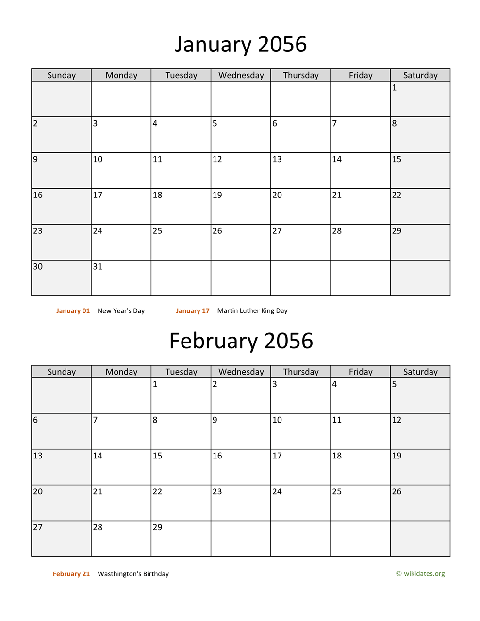 • January and February 2056 Calendar with US federal holidays as PDF (Adobe Reader PDF) in US letter paper format, free for download and print.