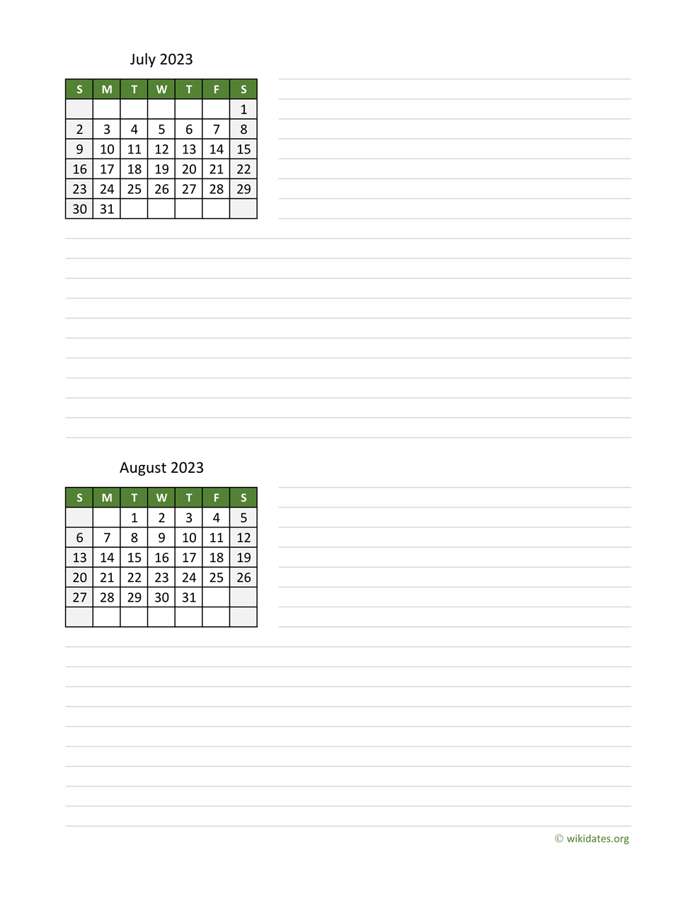 • July and August 2023 Calendar with US federal holidays as PDF (Adobe Reader PDF) in US letter paper format, free for download and print.