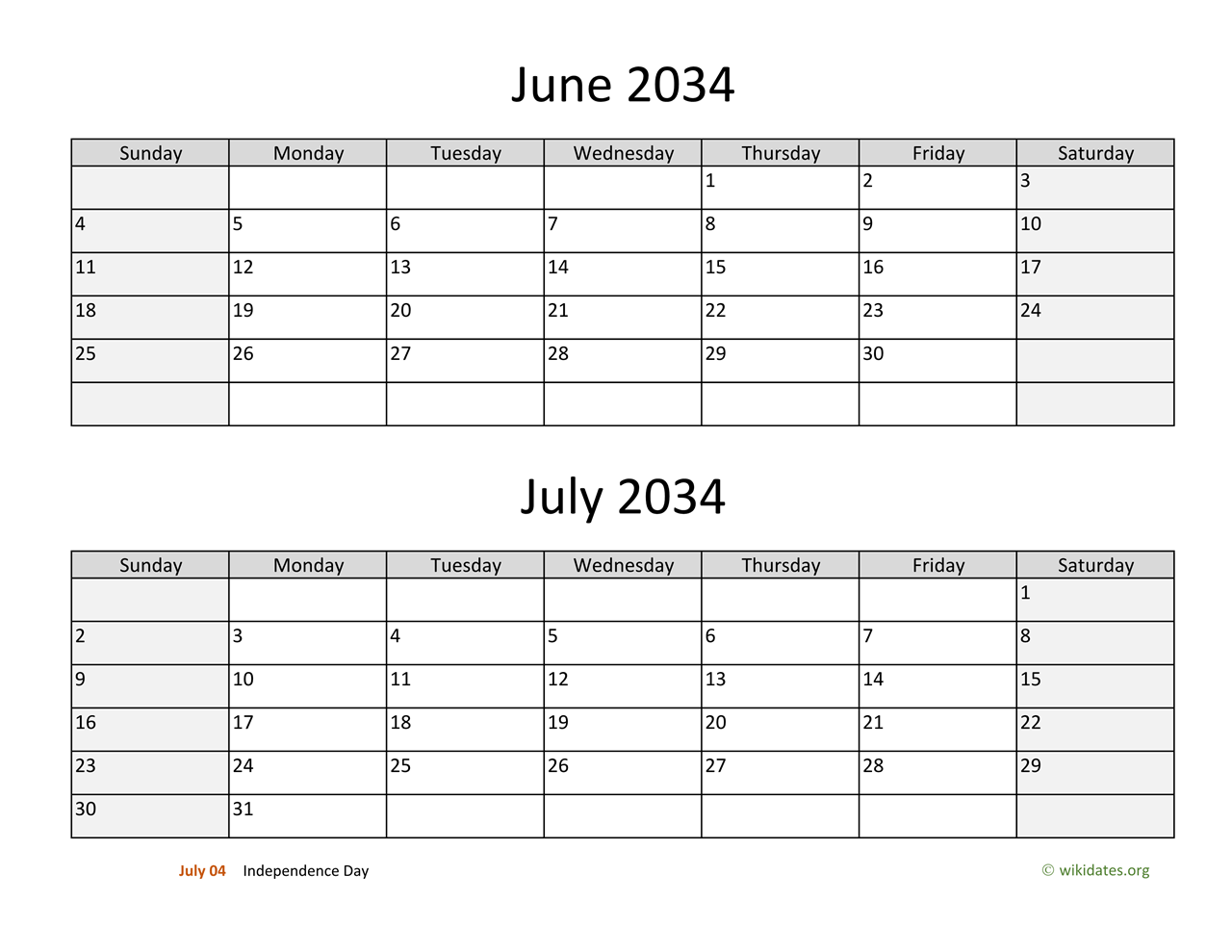 • June and July 2034 Calendar with US federal holidays as PDF (Adobe Reader PDF) in US letter paper format, free for download and print.