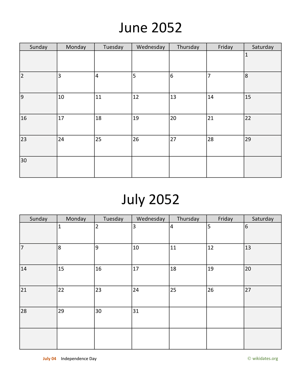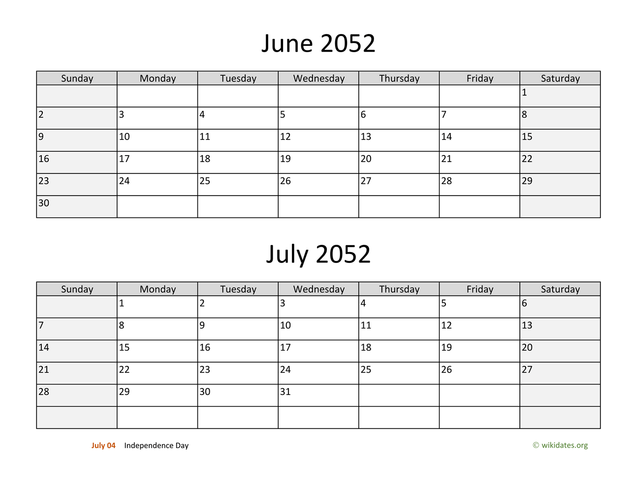 • June and July 2052 Calendar with US federal holidays as PDF (Adobe Reader PDF) in US letter paper format, free for download and print.