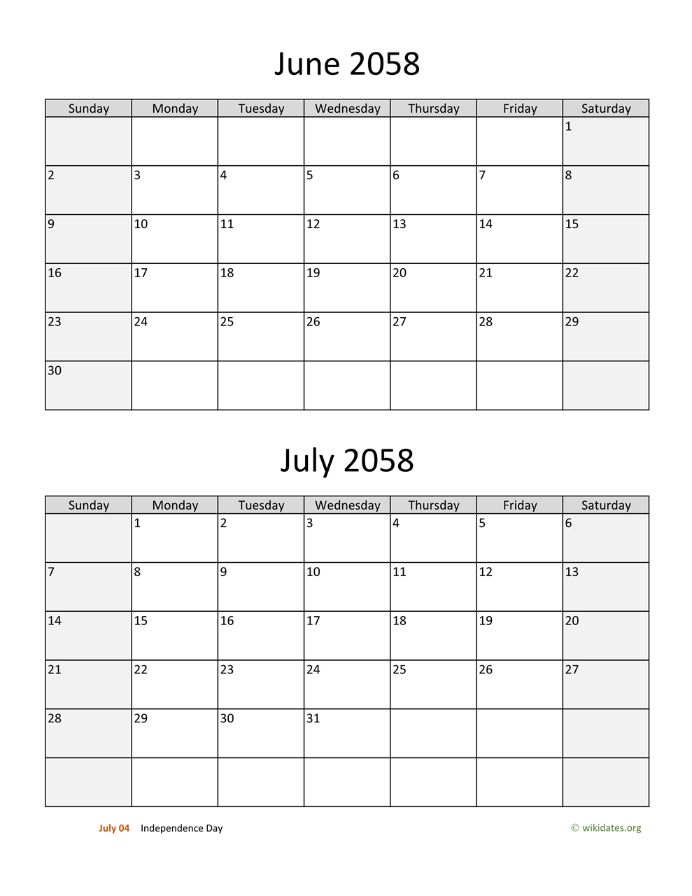 • June and July 2058 Calendar with US federal holidays as PDF (Adobe Reader PDF) in US letter paper format, free for download and print.