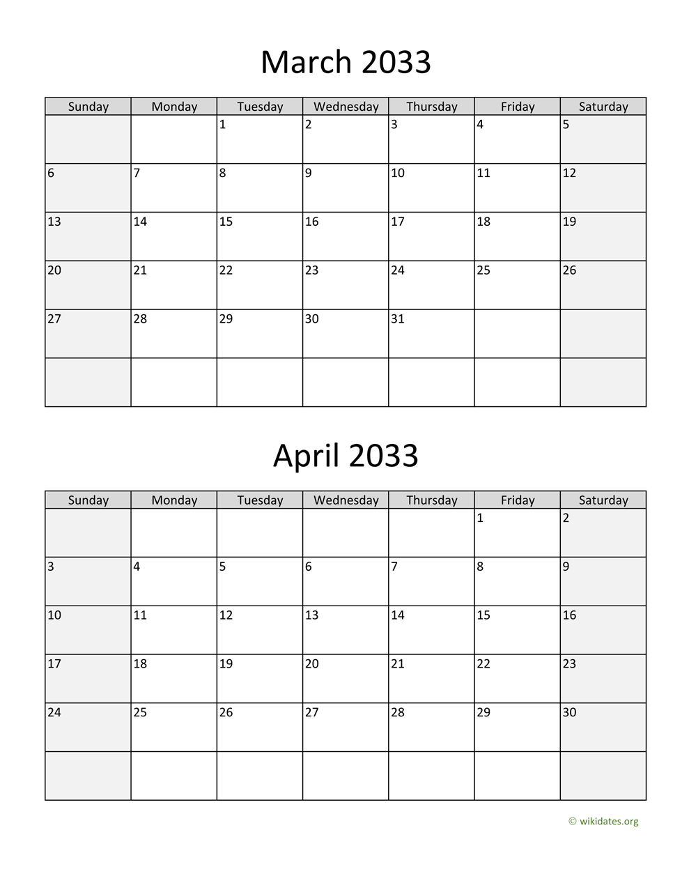 • March and April 2033 Calendar with US federal holidays as PDF (Adobe Reader PDF) in US letter paper format, free for download and print.