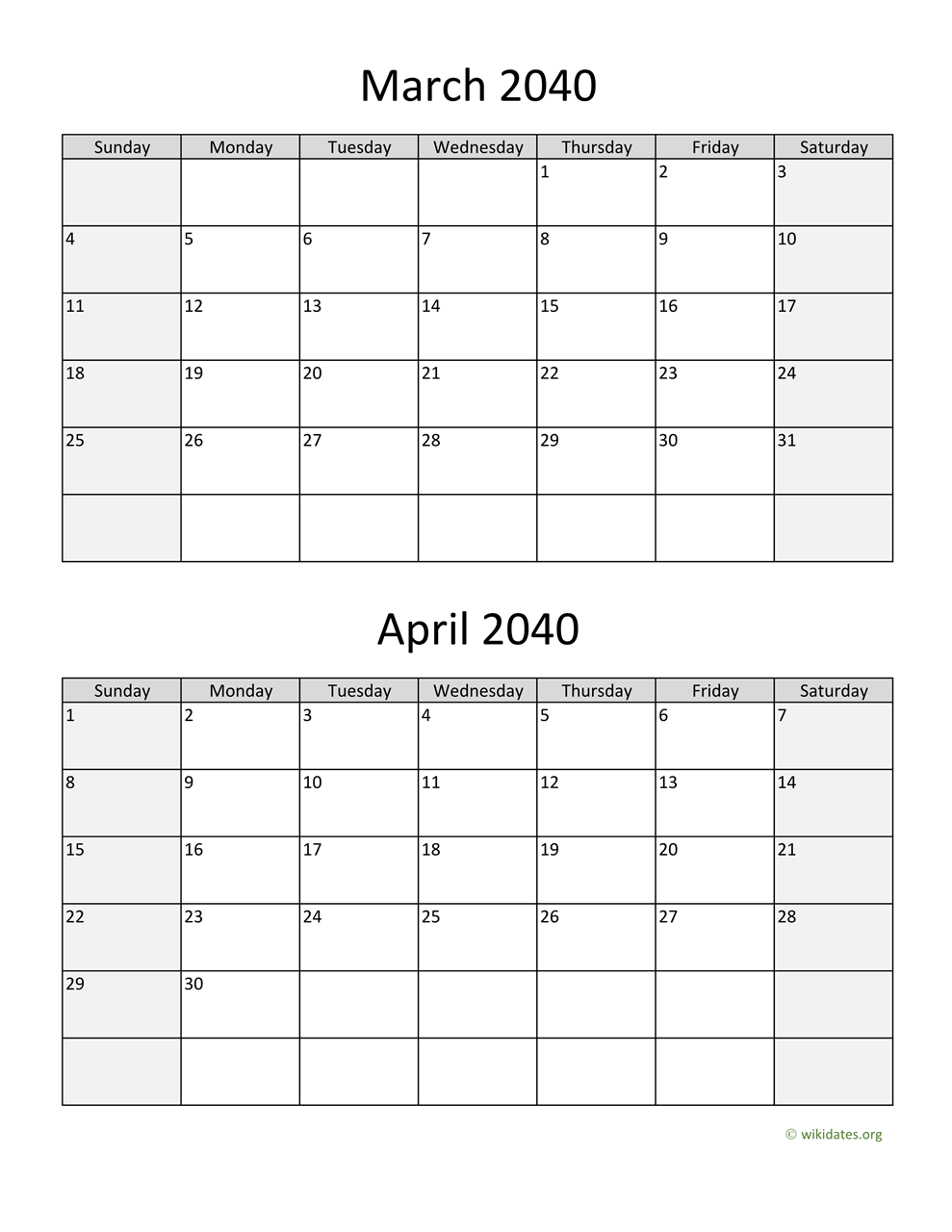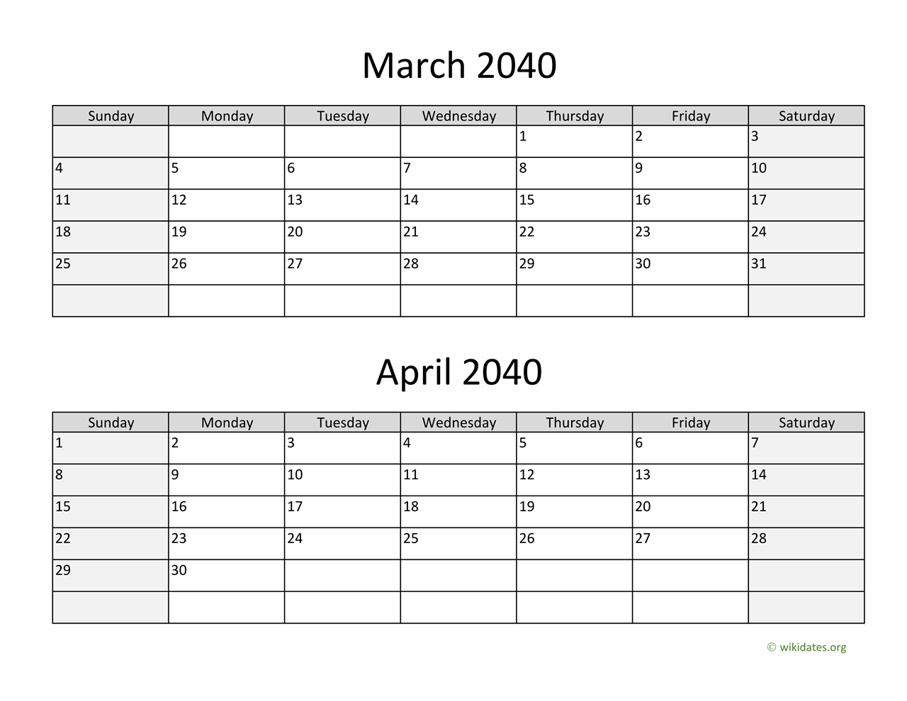 • March and April 2040 Calendar with US federal holidays as PDF (Adobe Reader PDF) in US letter paper format, free for download and print.