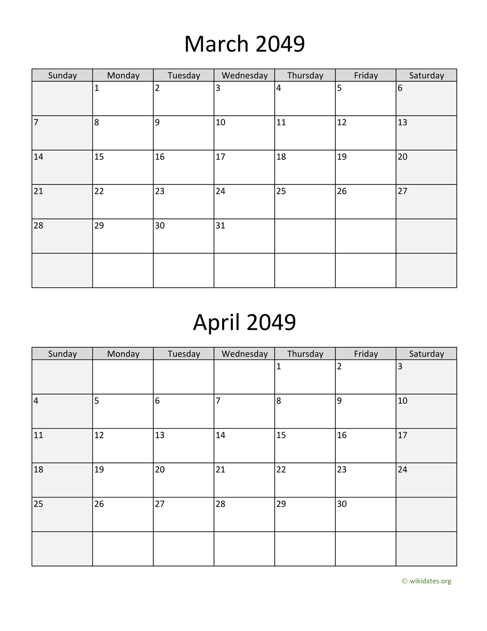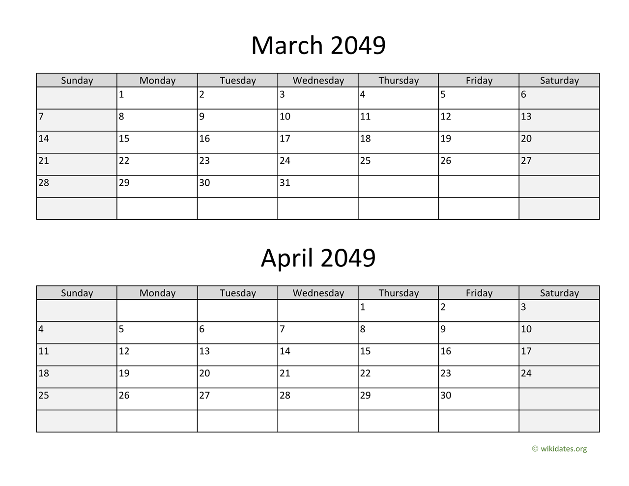 • March and April 2049 Calendar with US federal holidays as PDF (Adobe Reader PDF) in US letter paper format, free for download and print.