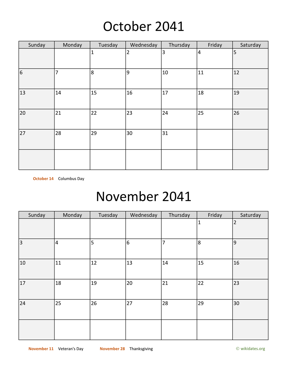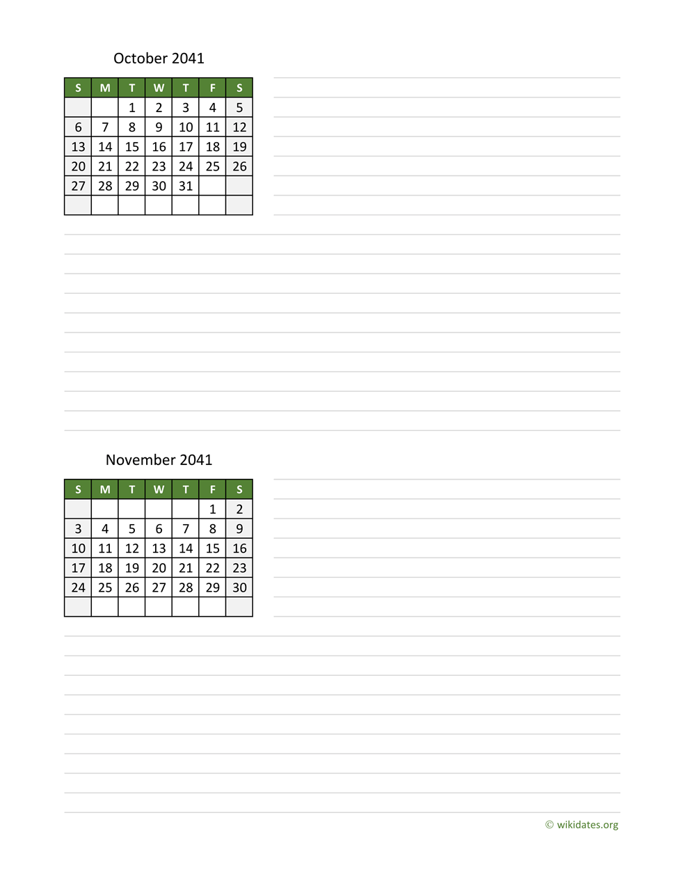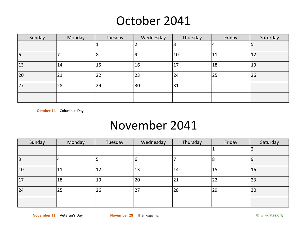 • October and November 2041 Calendar with US federal holidays as PDF (Adobe Reader PDF) in US letter paper format, free for download and print.