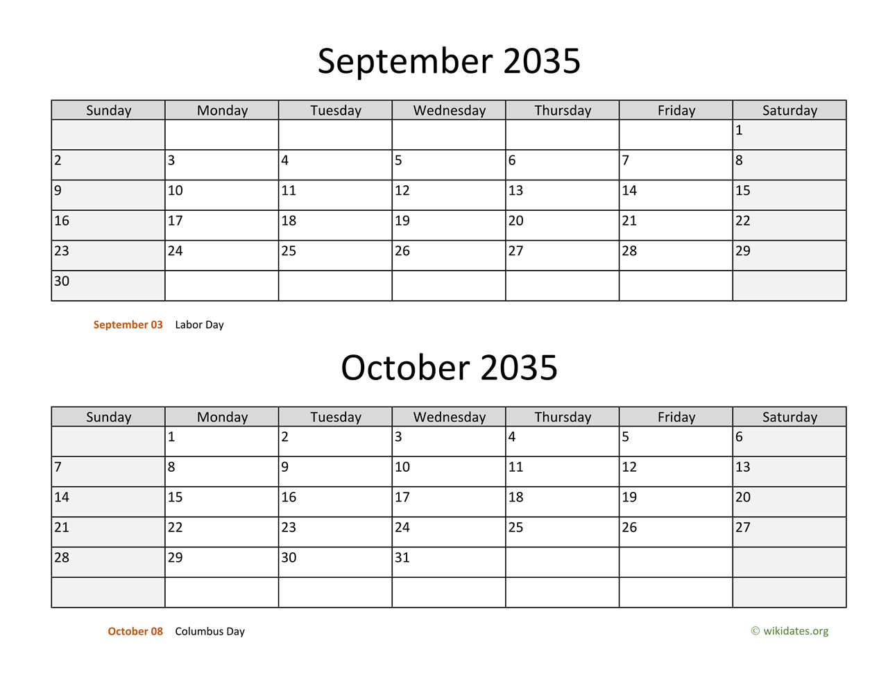 • September and October 2035 Calendar with US federal holidays as PDF (Adobe Reader PDF) in US letter paper format, free for download and print.