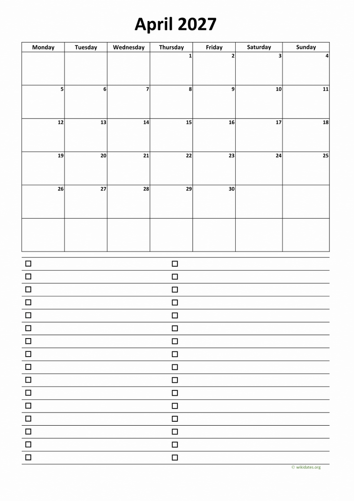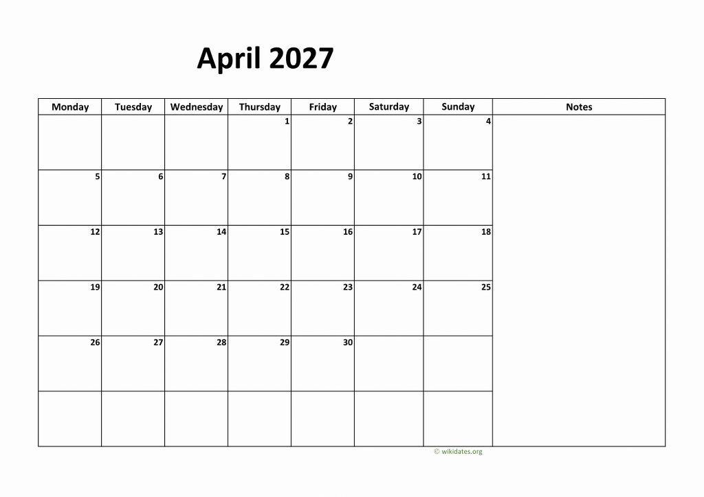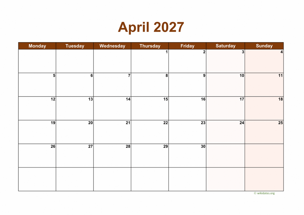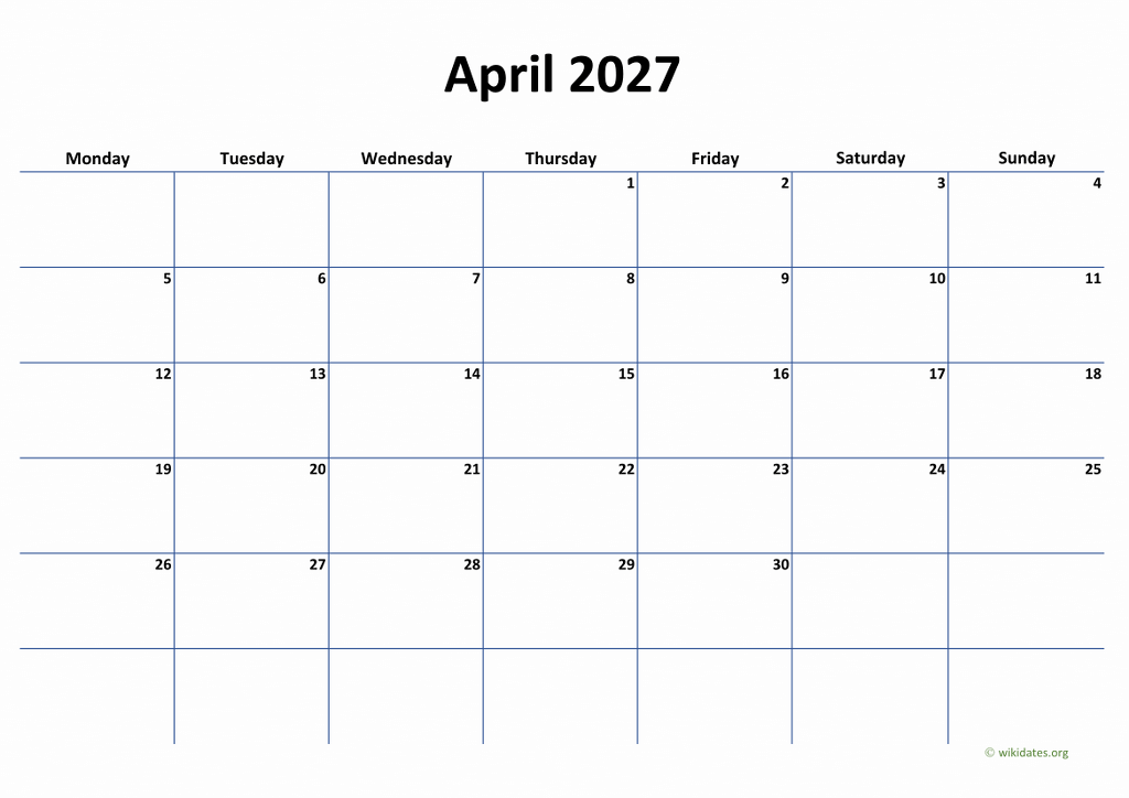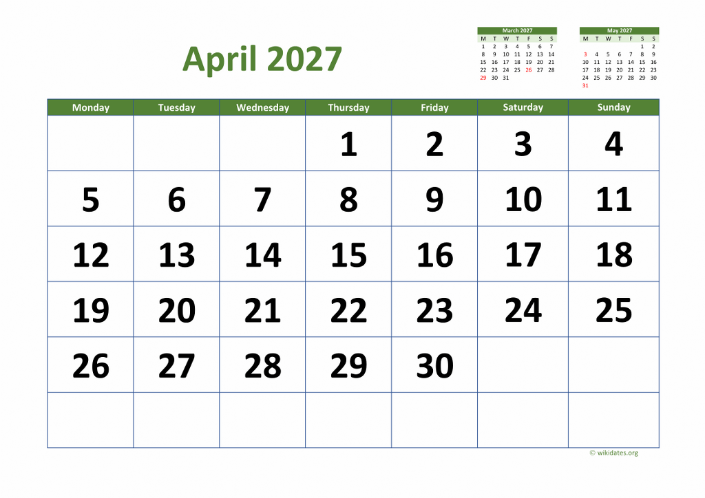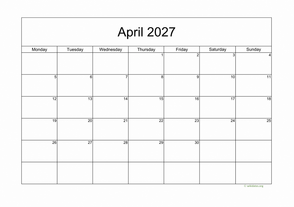 Printable calendar april 2027 templates for United Kingdom (UK). Print or download calendar april 2027 (week starts on Monday) as MS Word (.docx), PDF and PNG in A4 paper format.