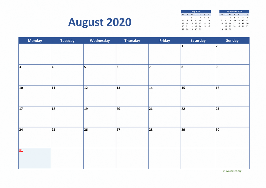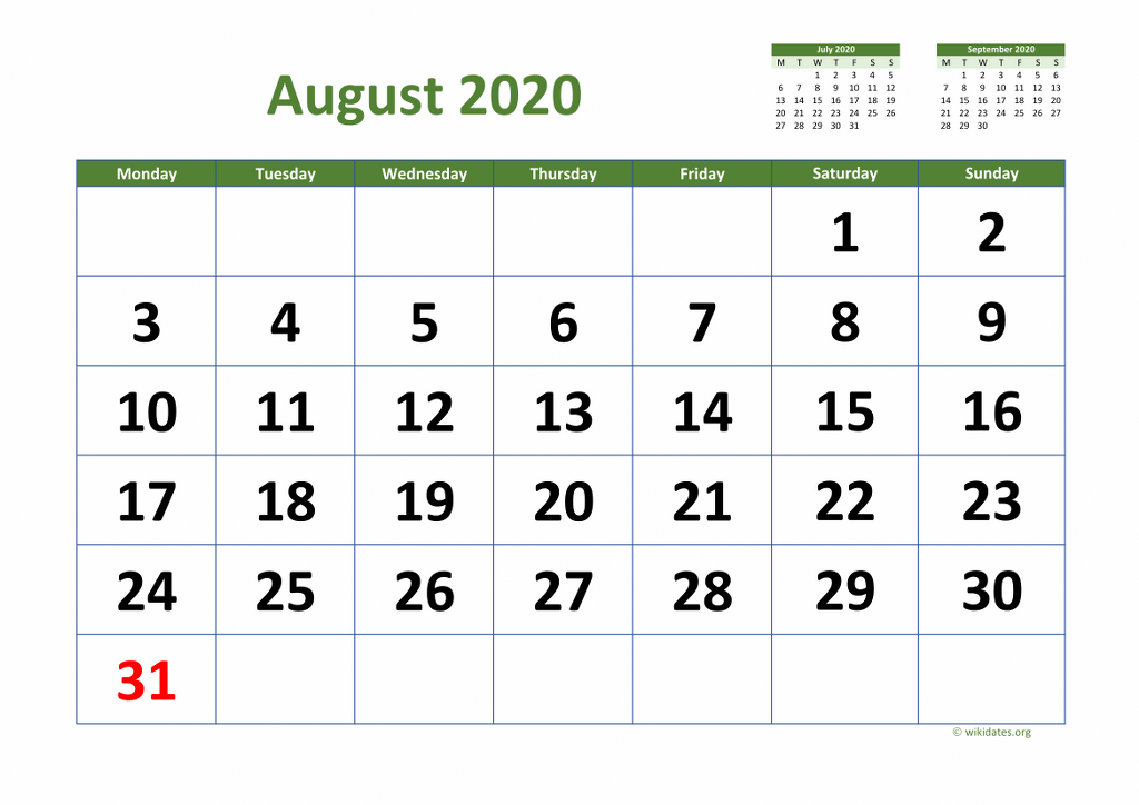 Printable calendar august 2020 templates for United Kingdom (UK). Print or download calendar august 2020 (week starts on Monday) as MS Word (.docx), PDF and PNG in A4 paper format.