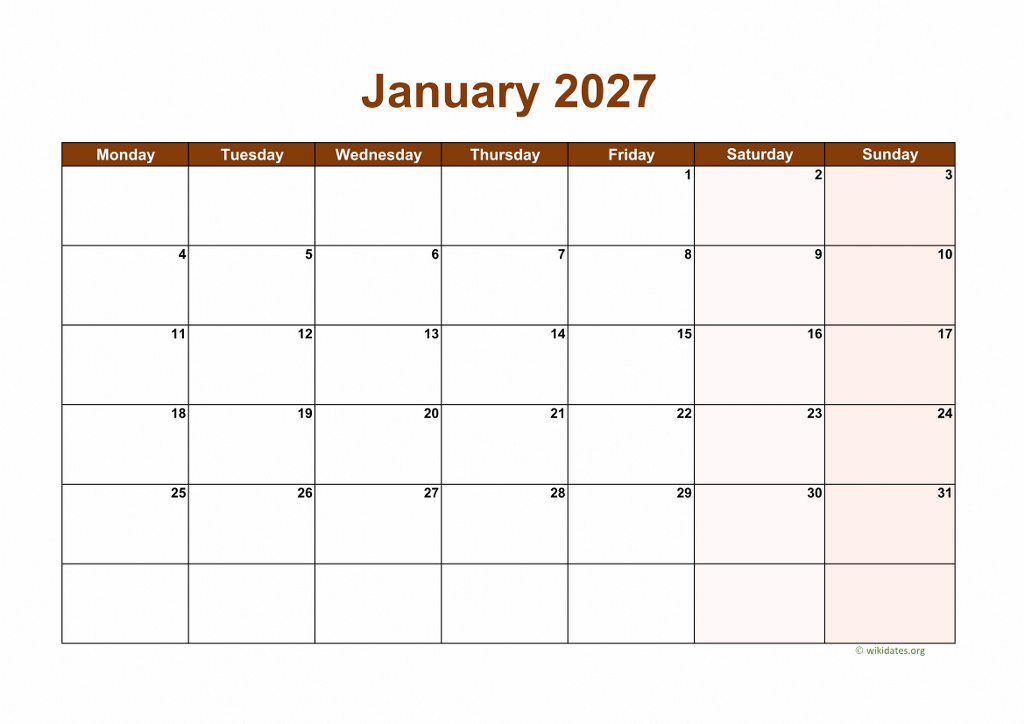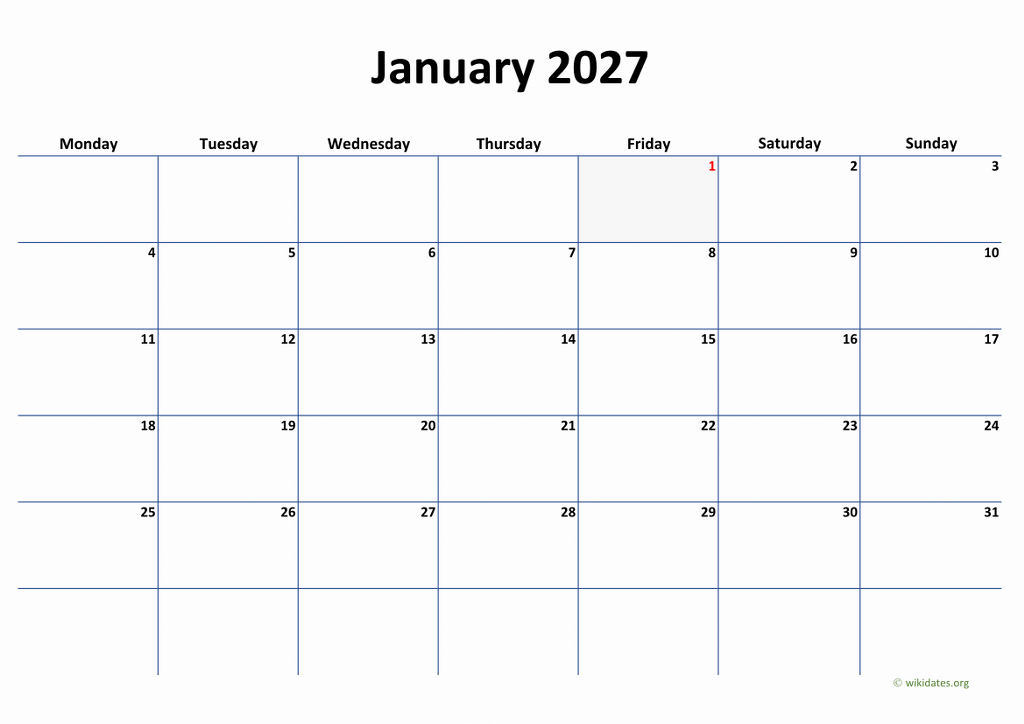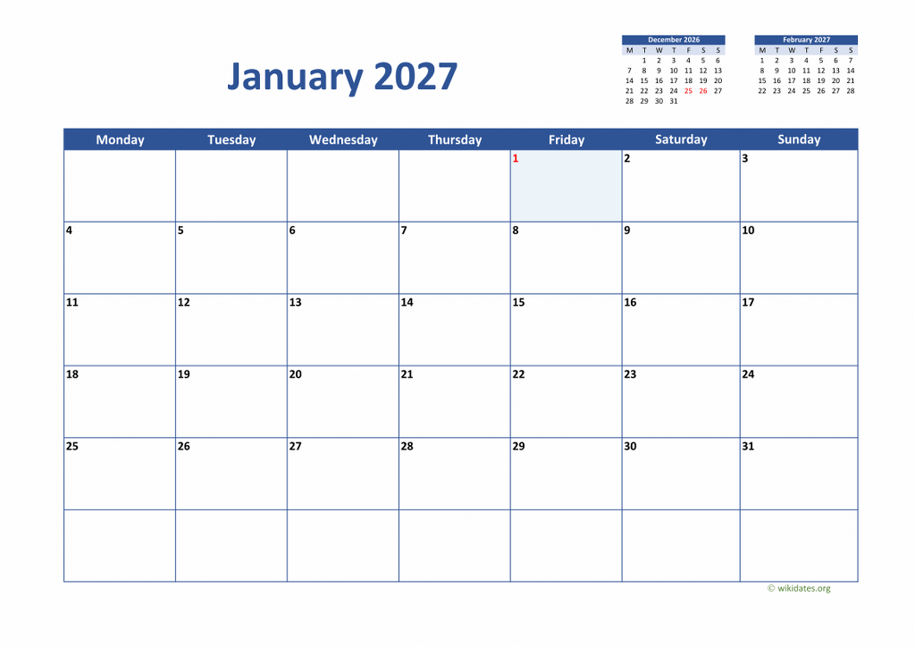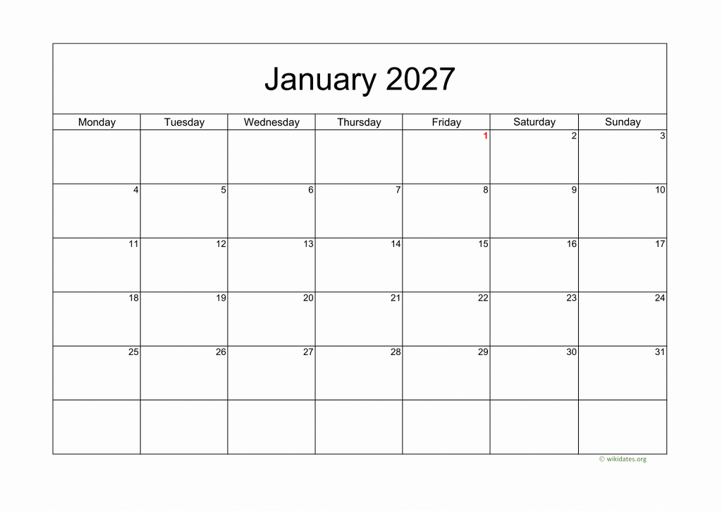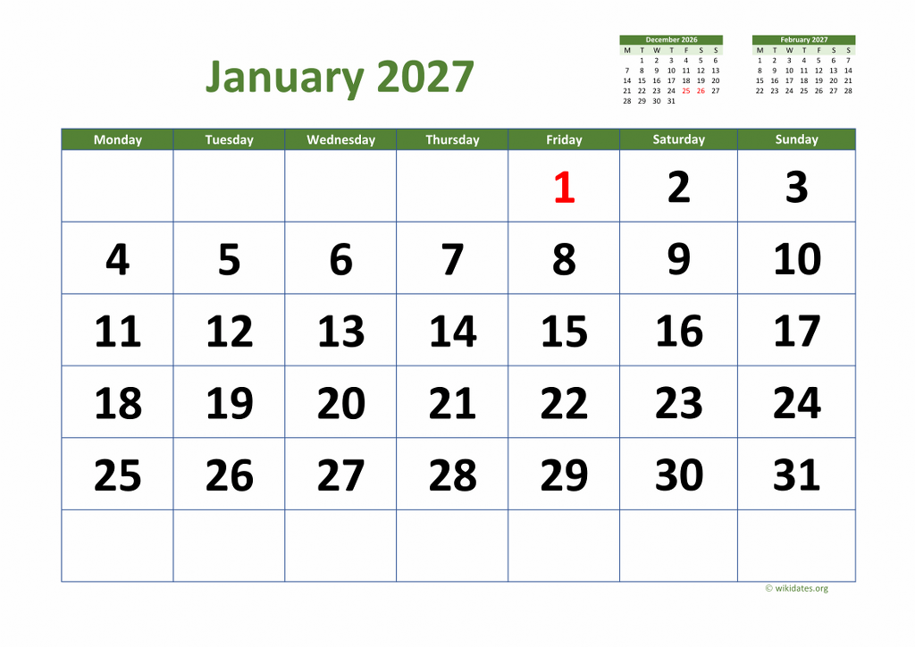 Printable calendar january 2027 templates for United Kingdom (UK). Print or download calendar january 2027 (week starts on Monday) as MS Word (.docx), PDF and PNG in A4 paper format.