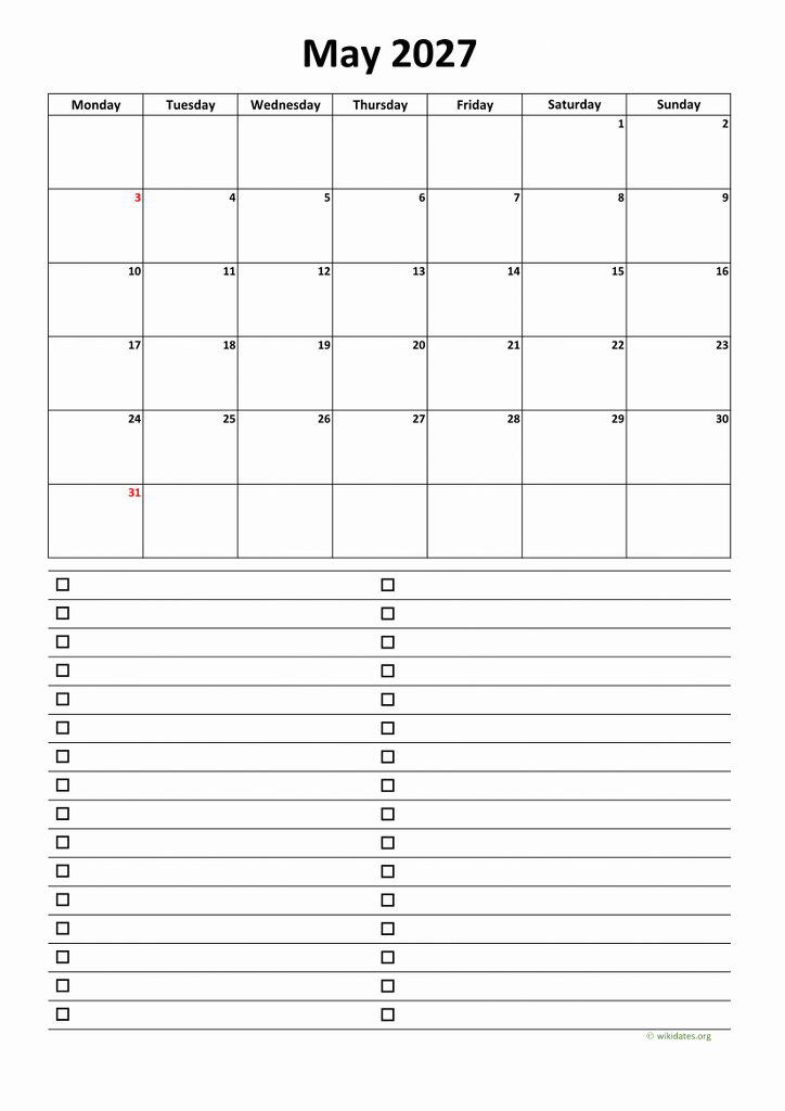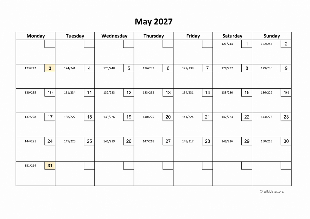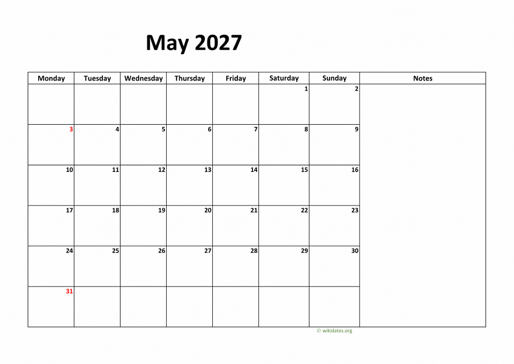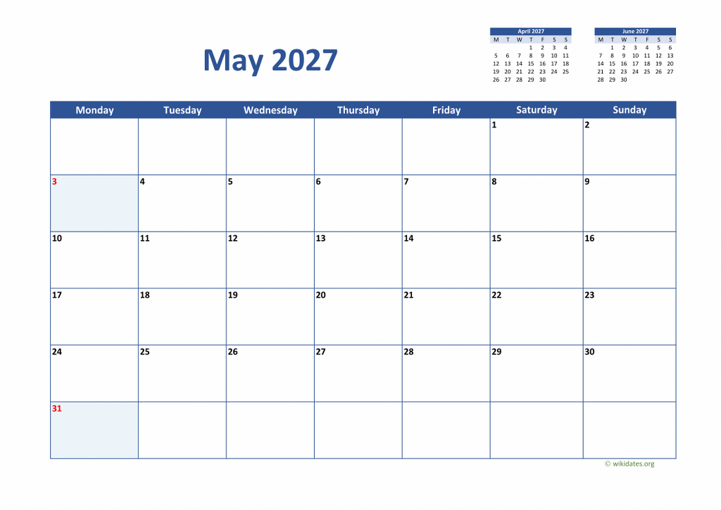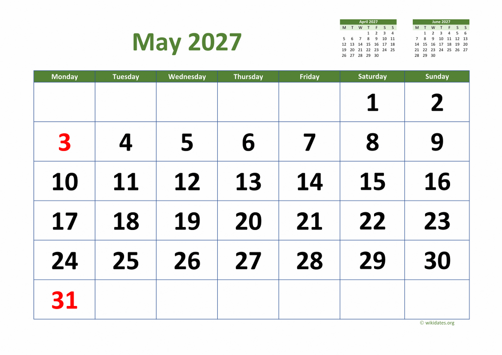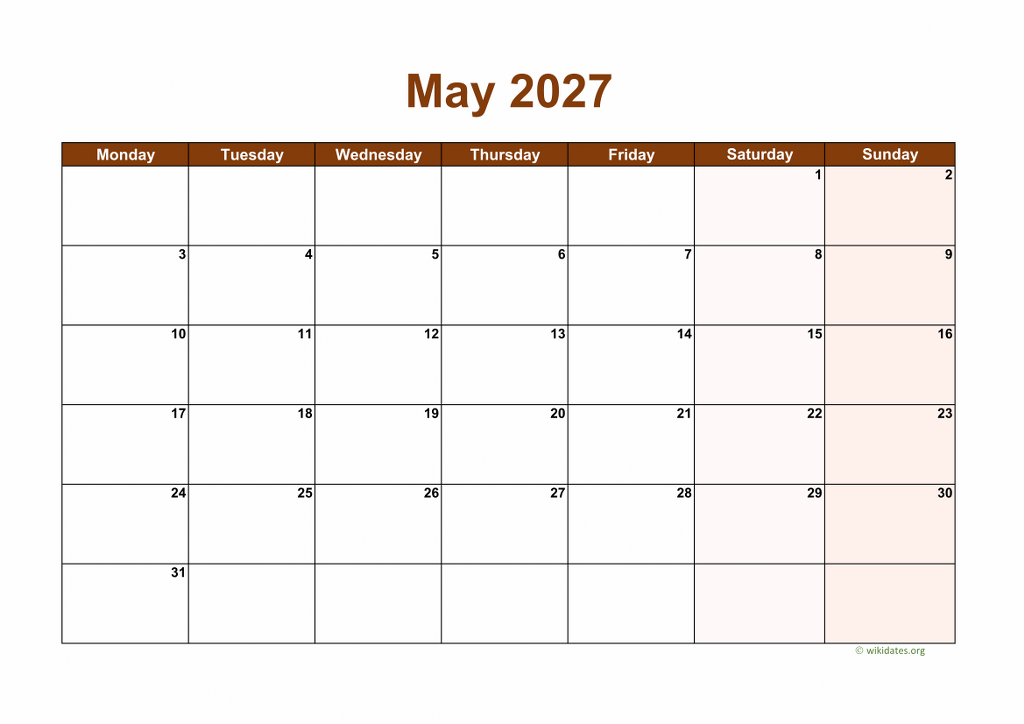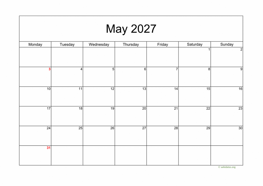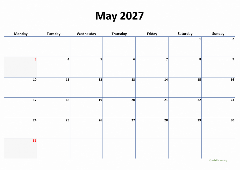 Printable calendar may 2027 templates for United Kingdom (UK). Print or download calendar may 2027 (week starts on Monday) as MS Word (.docx), PDF and PNG in A4 paper format.